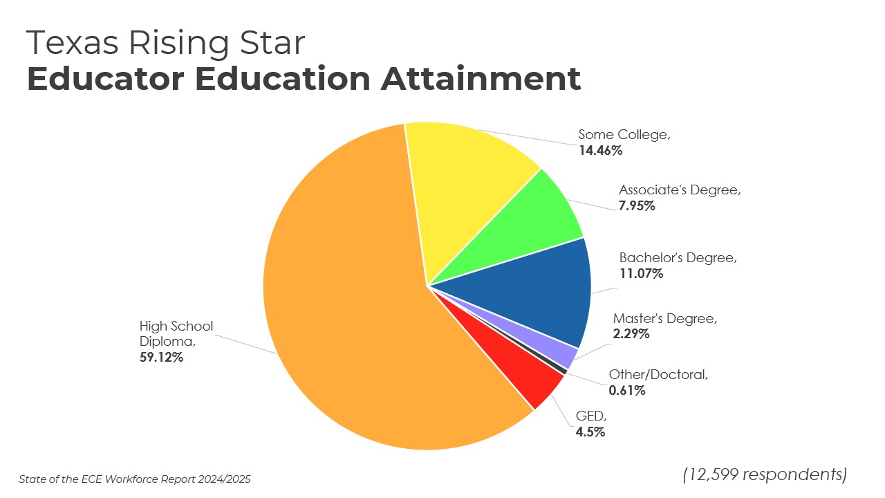 While participation in TECPDS continues to expand statewide, the overall pattern is consistent with the national early childhood workforce profile: over half of the early educators have earned less than an associate’s degree, and two-thirds have earned less than a bachelor’s degree. These findings have remained stable across recent years of TECPDS reporting. These distributions are consistent with current Child Care Regulation requirements for a High School diploma or General Education Development Test (GED) to work in child care settings, and align with findings from recent Texas workforce surveys (2025 Texas Career Pathway Study4 and 2022 Texas Director Survey5.