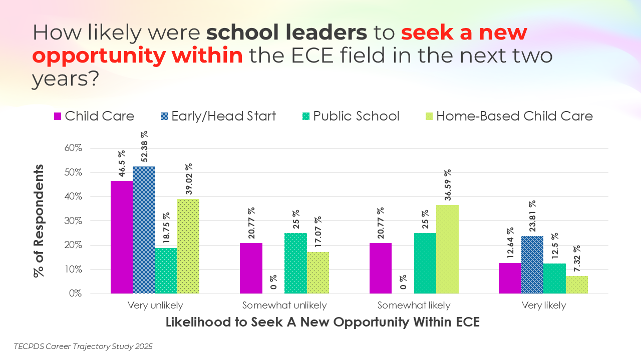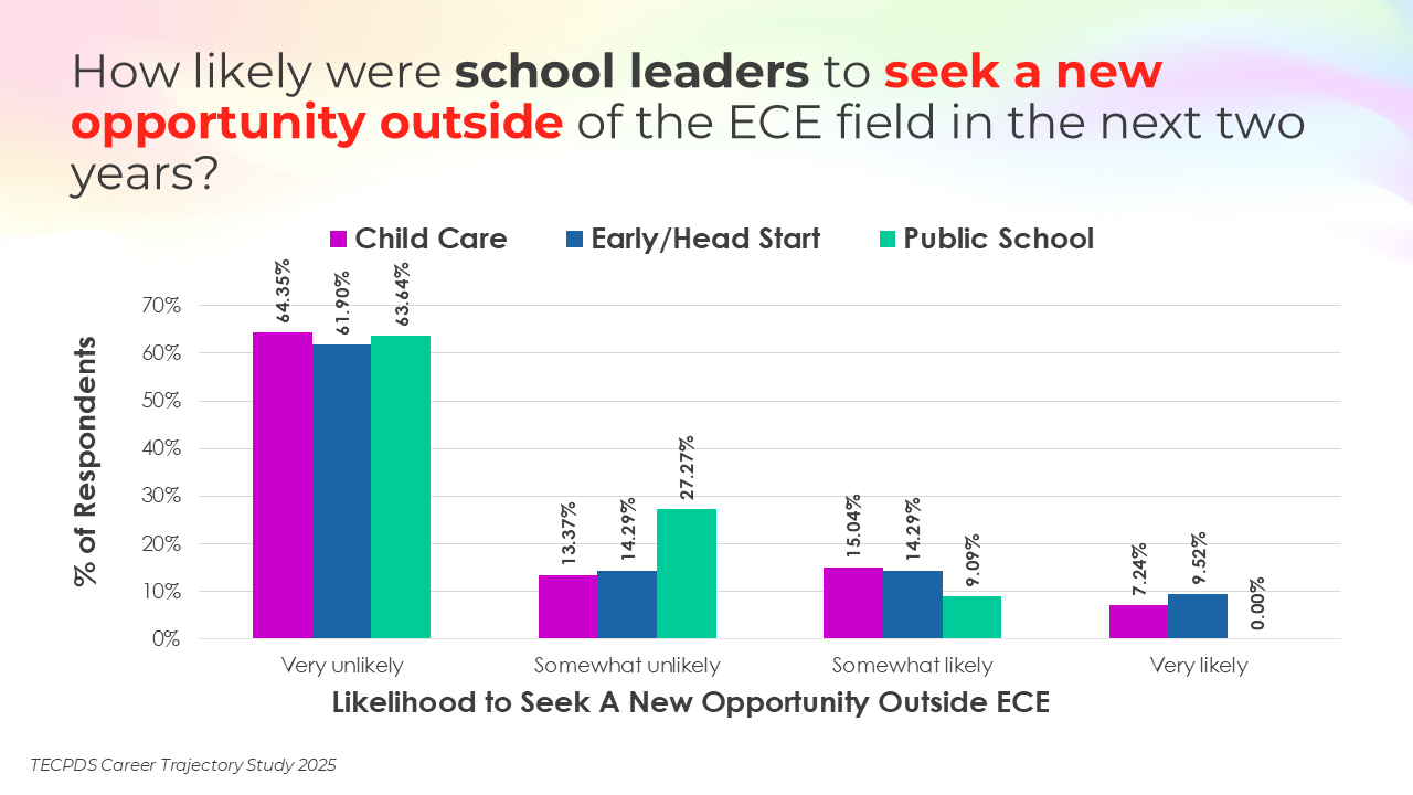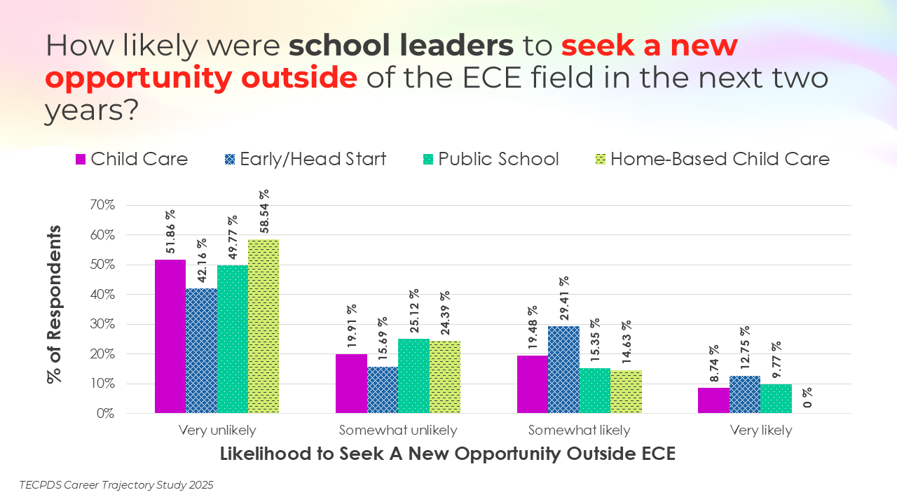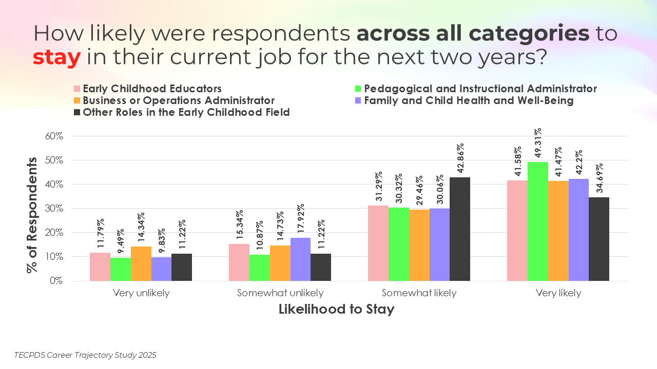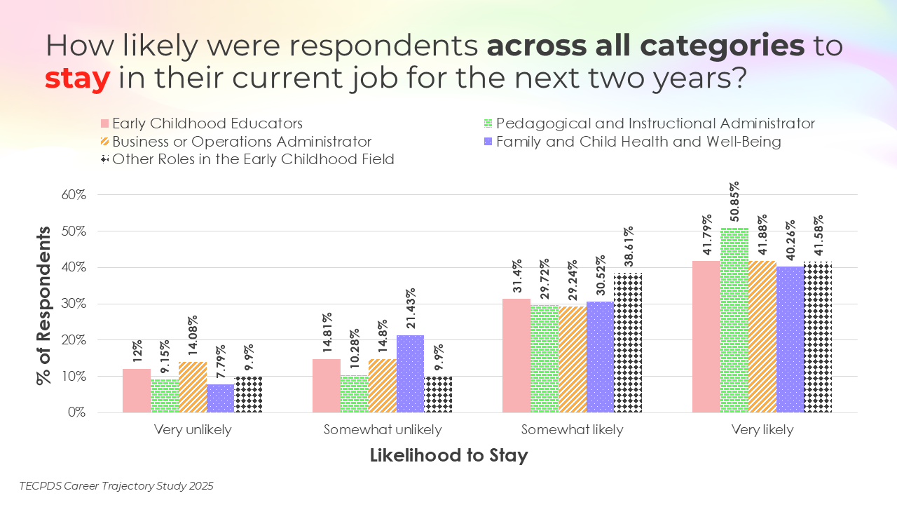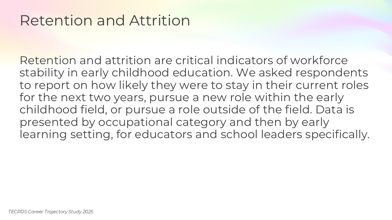 Retention and attrition are critical indicators of workforce stability in early childhood education. We asked respondents to report on how likely they were to stay in their current roles for the next two years, pursue a new role within the early childhood field, or pursue a role outside of the field. Data is presented by occupational category and then by early learning setting, for educators and school leaders specifically.