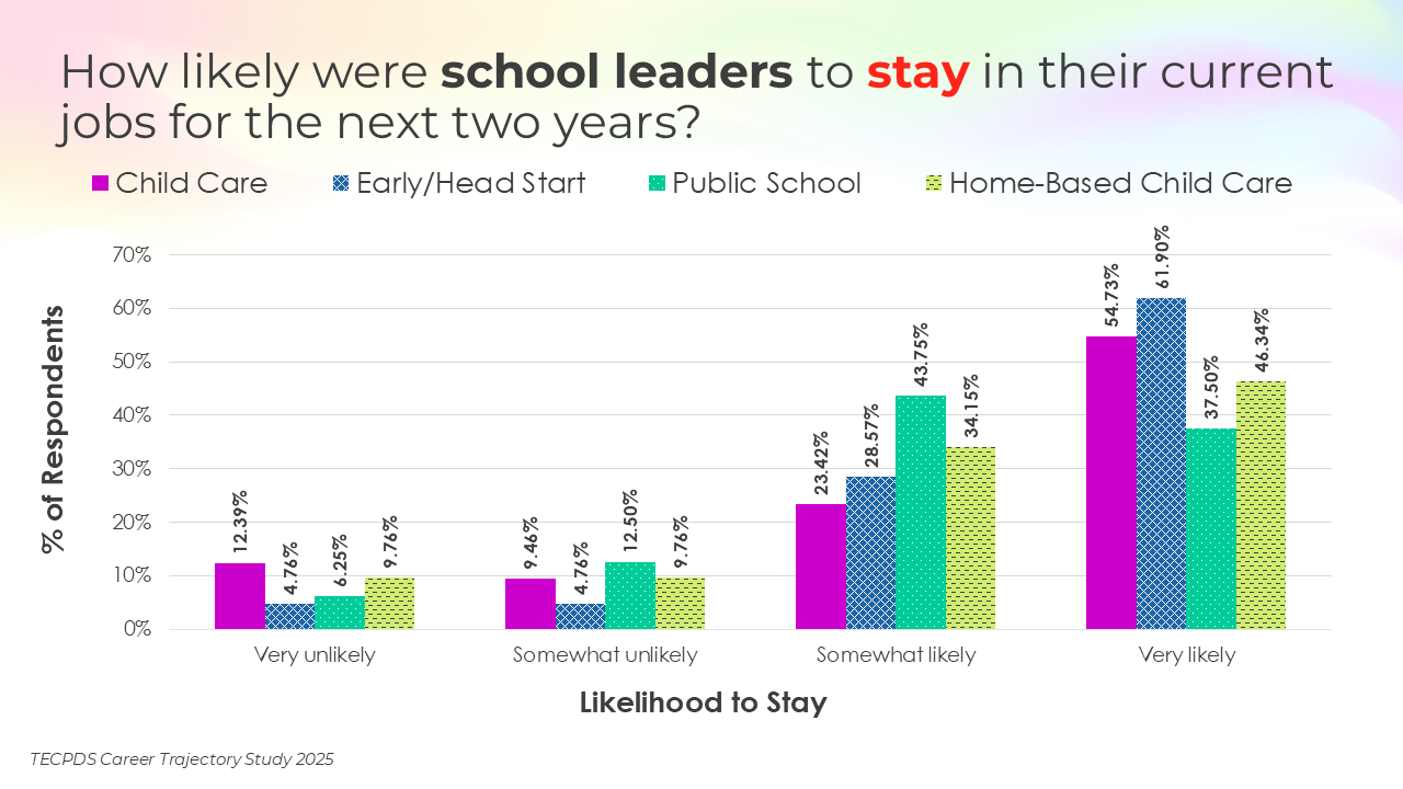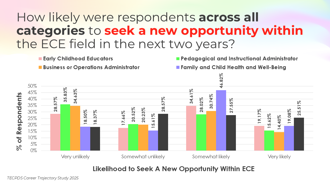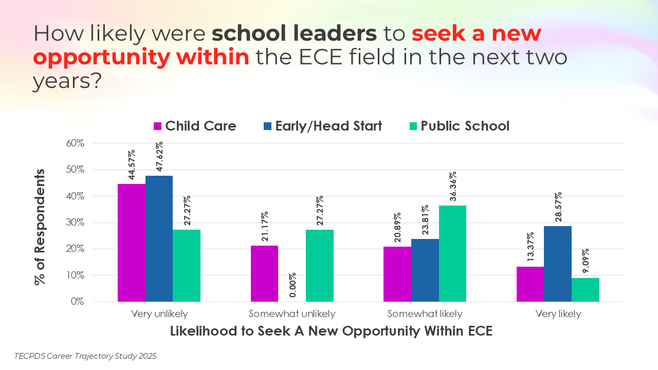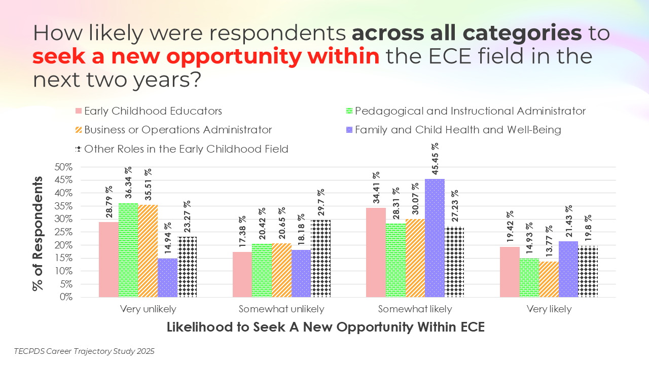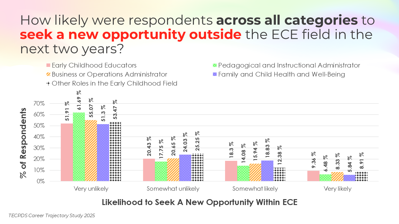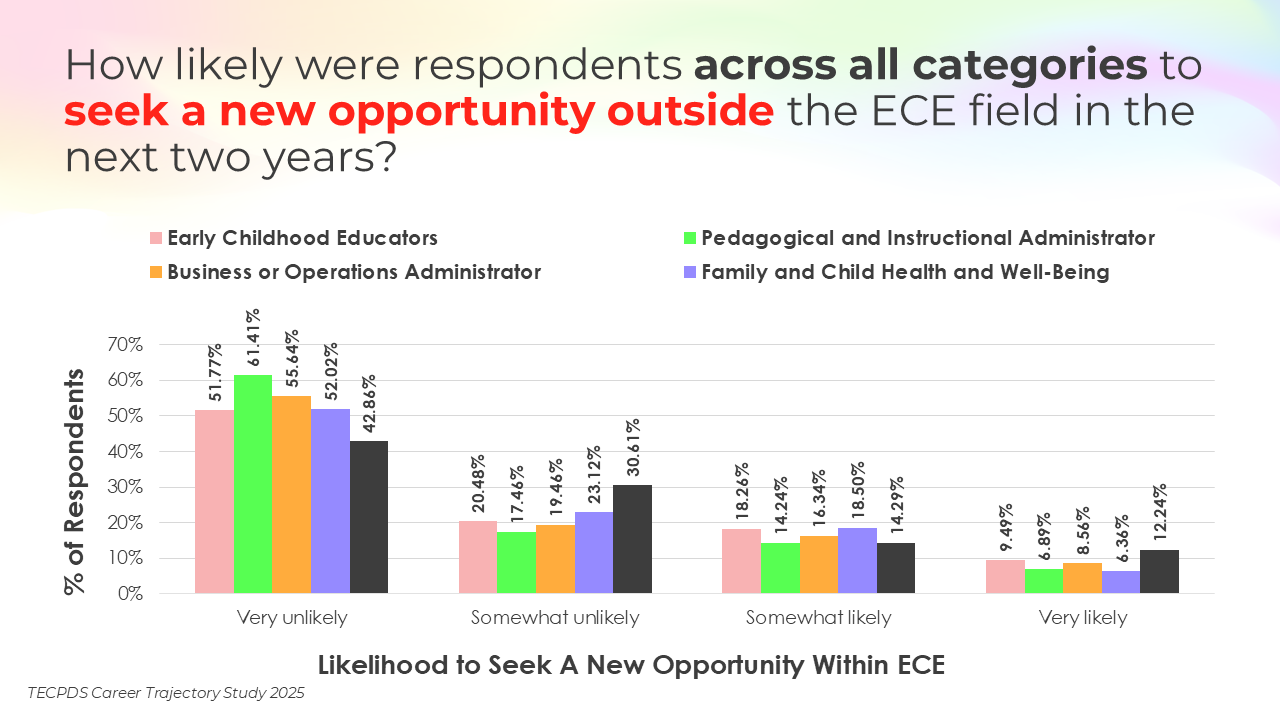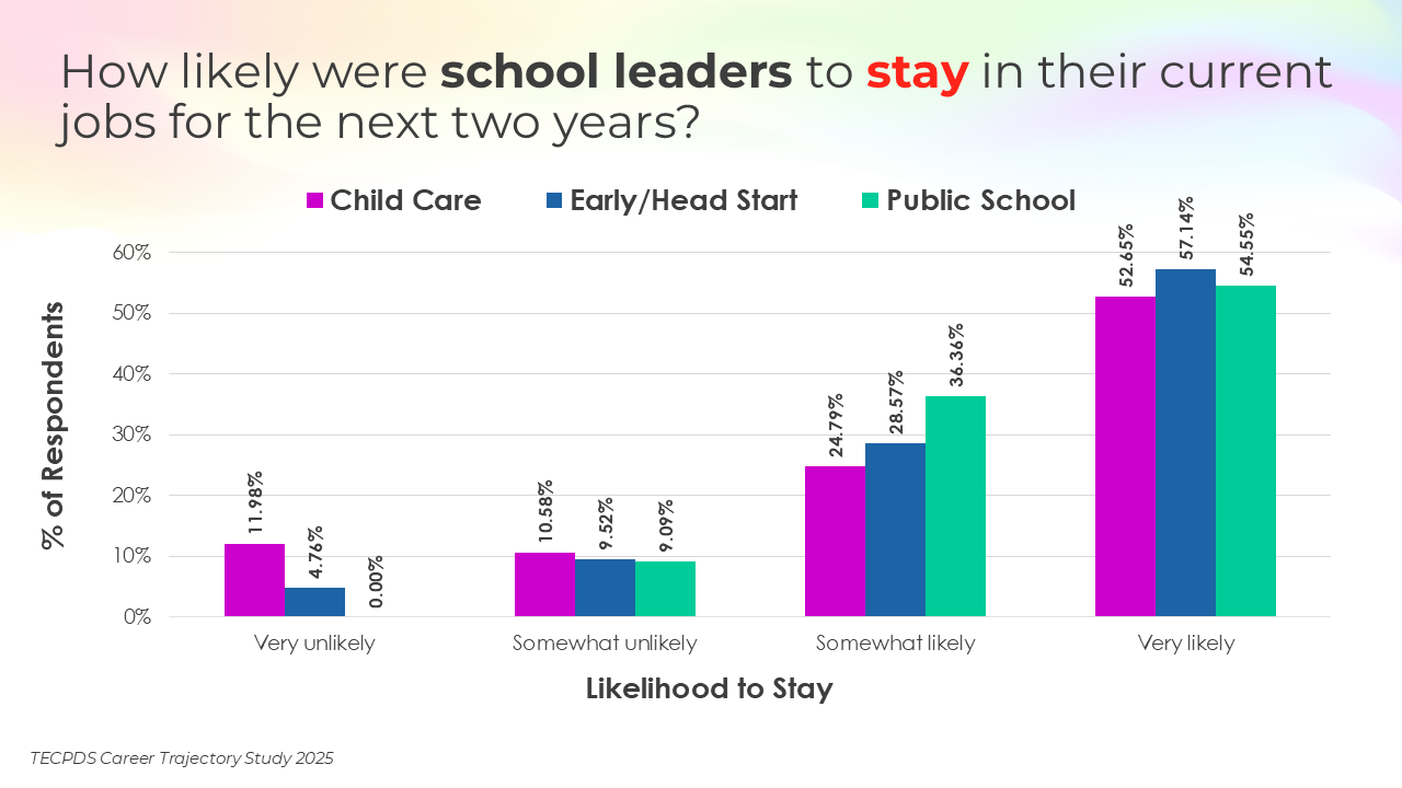 Retention and attrition are critical indicators of workforce stability in early childhood education. We asked respondents to report on how likely they were to stay in their current roles for the next two years, pursue a new role within the early childhood field, or pursue a role outside of the field. Data is presented by occupational category and then by early learning setting, for educators and school leaders specifically.