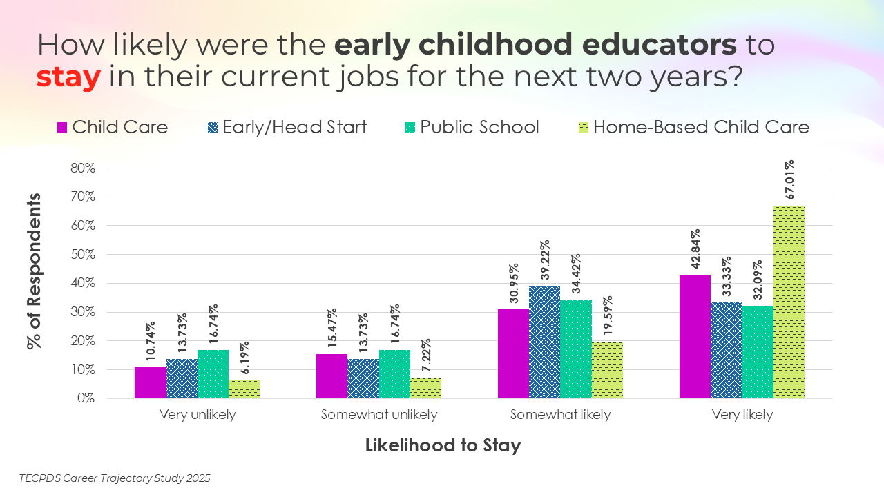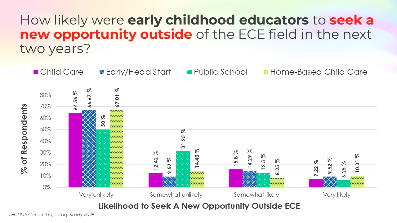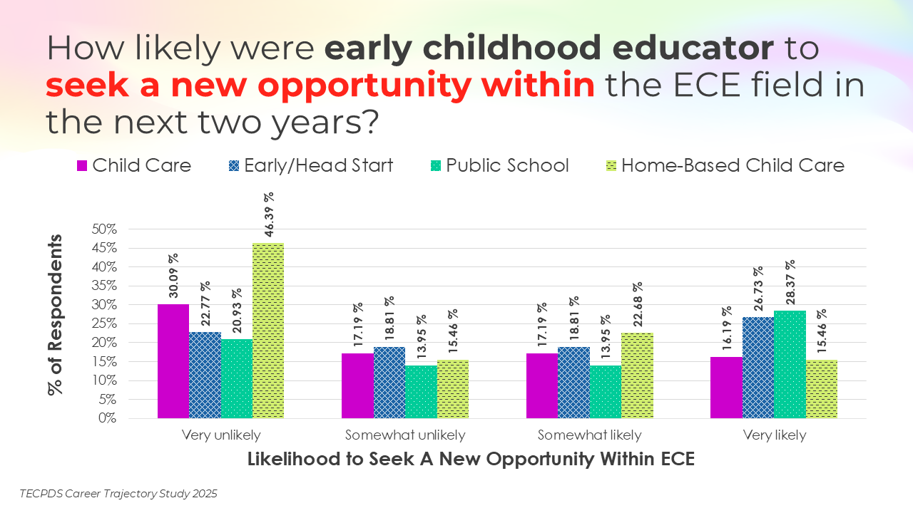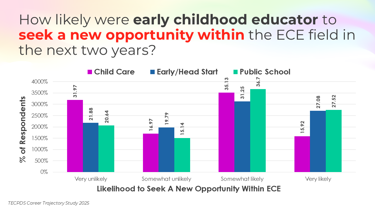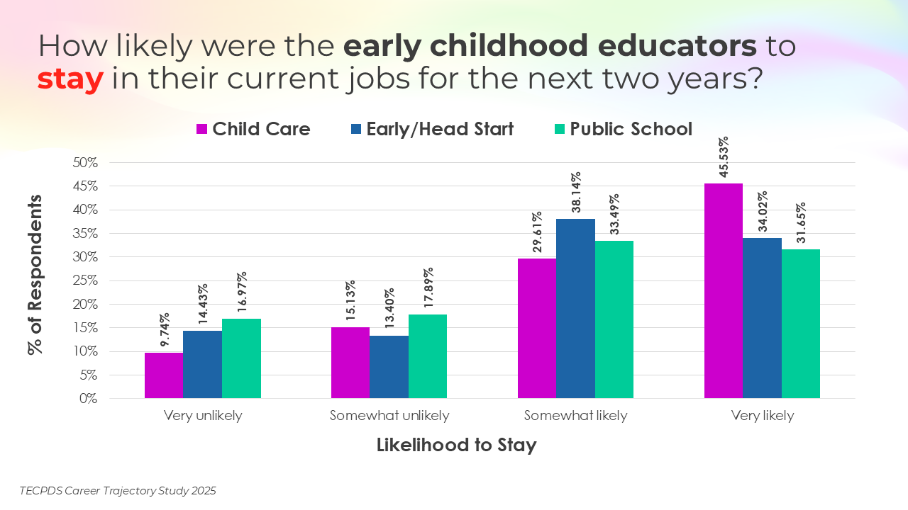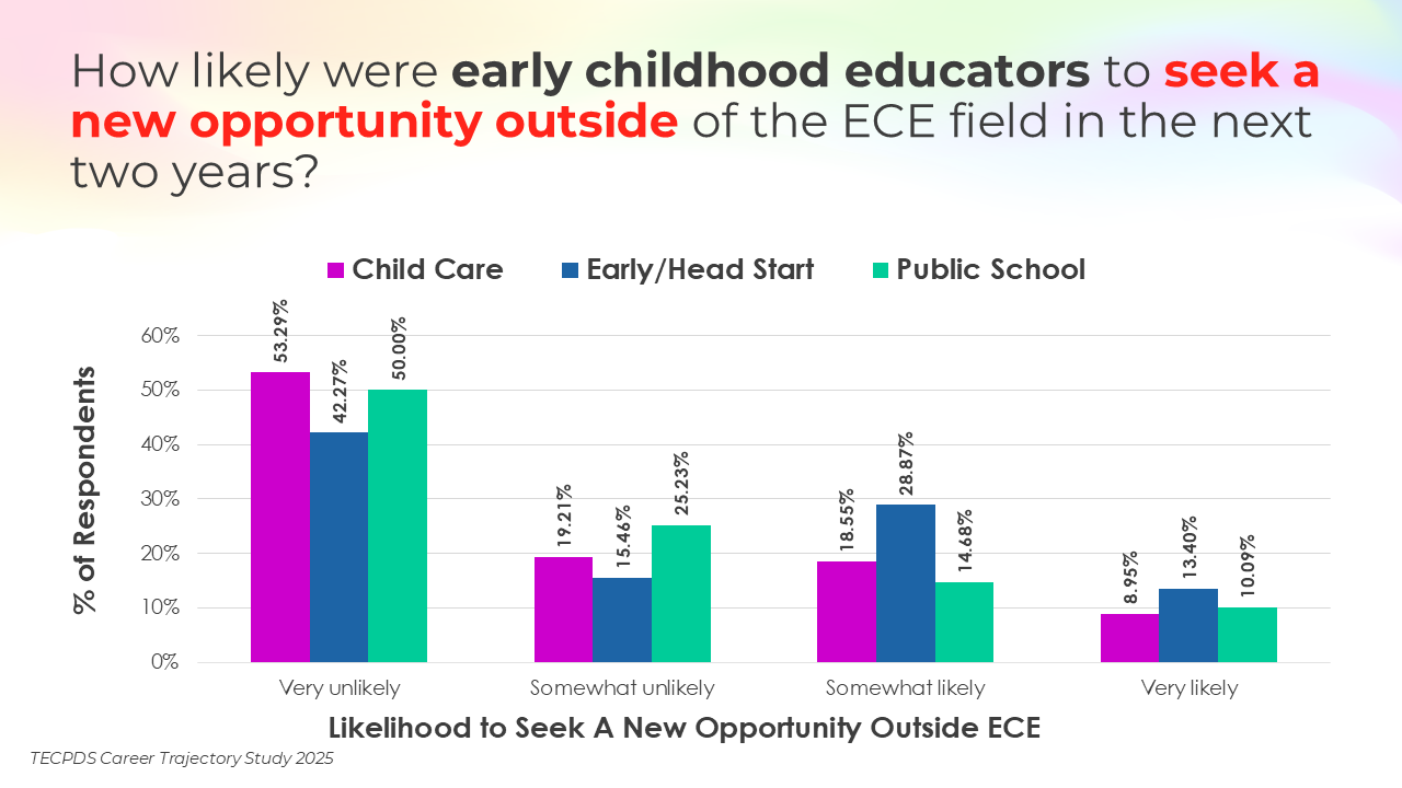 Retention and attrition are critical indicators of workforce stability in early childhood education. We asked respondents to report on how likely they were to stay in their current roles for the next two years, pursue a new role within the early childhood field, or pursue a role outside of the field. Data is presented by occupational category and then by early learning setting, for educators and school leaders specifically.