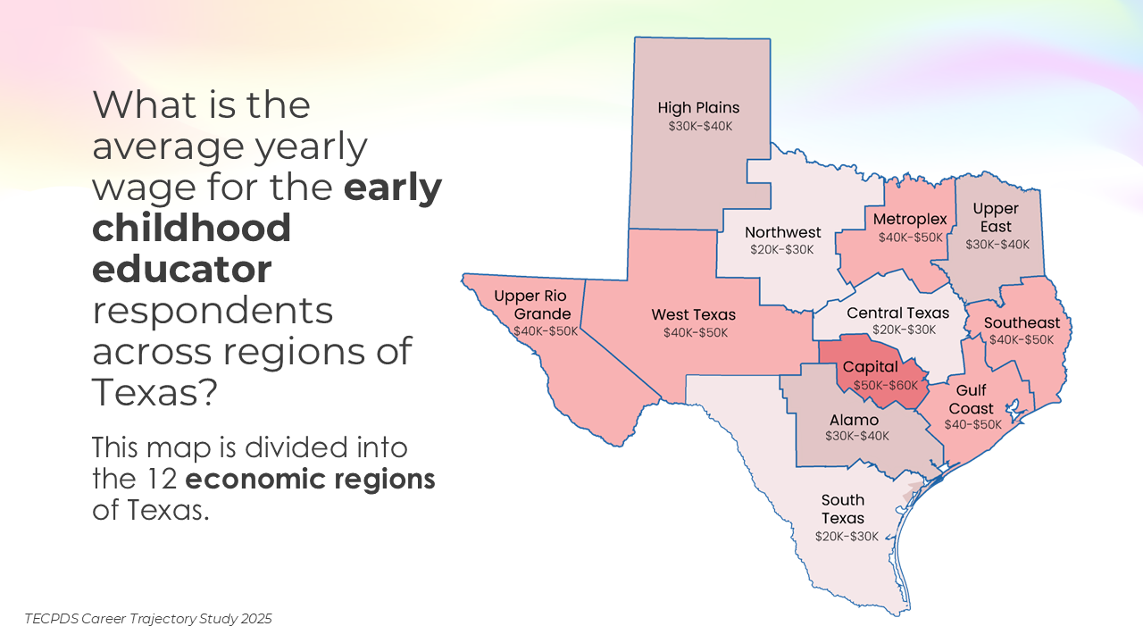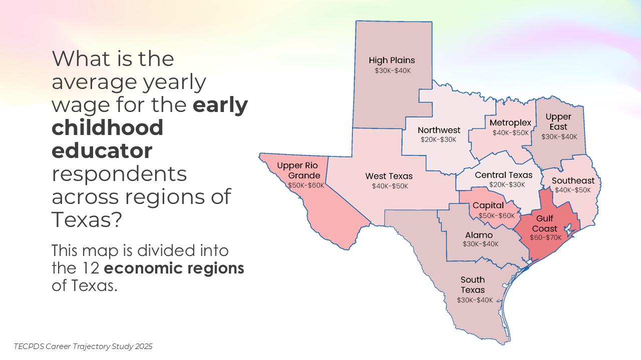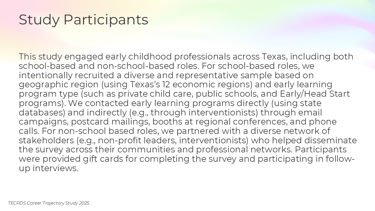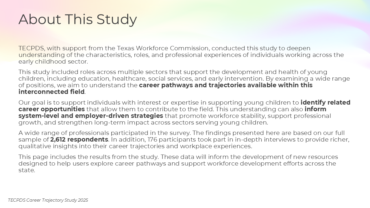 TECPDS, with support from the Texas Workforce Commission, conducted this study to deepen understanding of the characteristics, roles, and professional experiences of individuals working across the early childhood sector.
