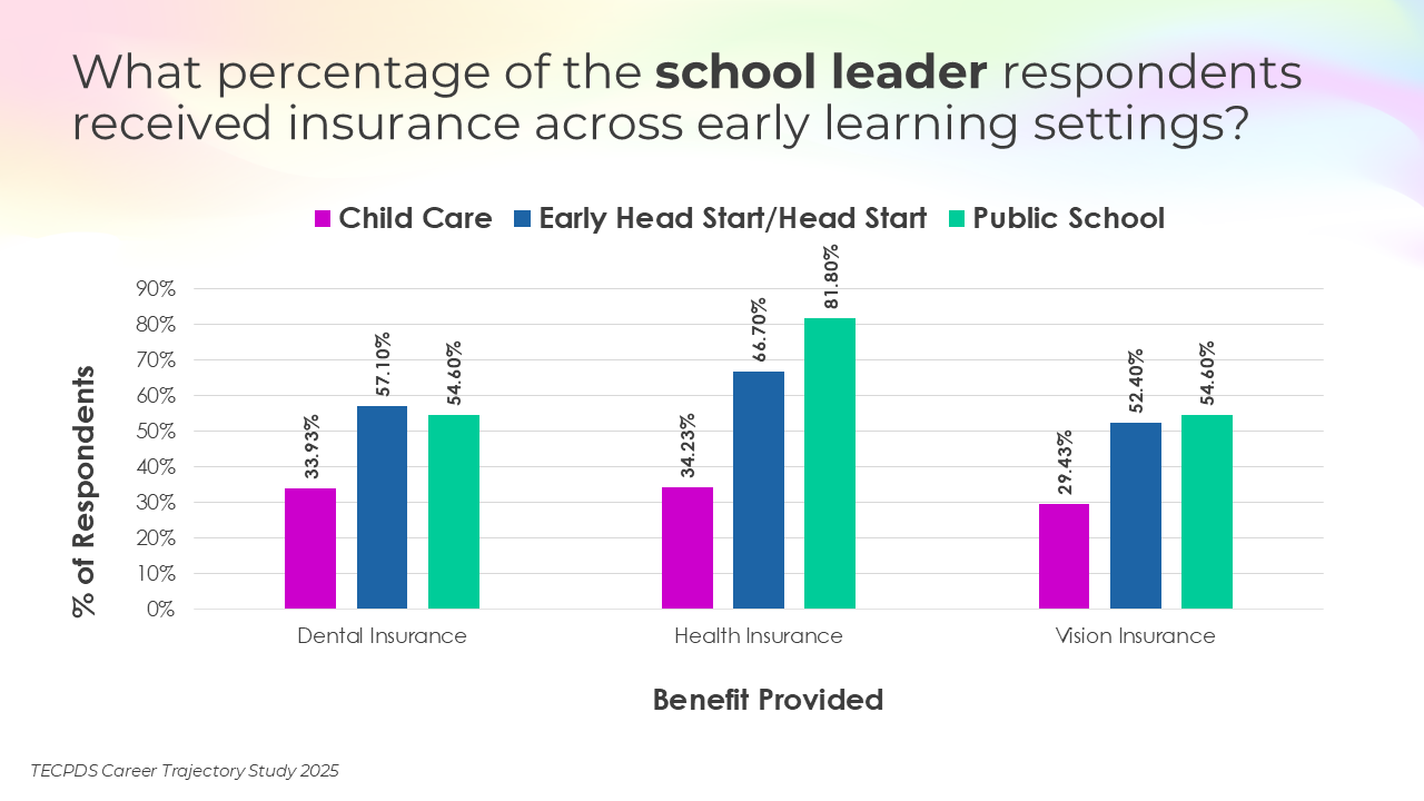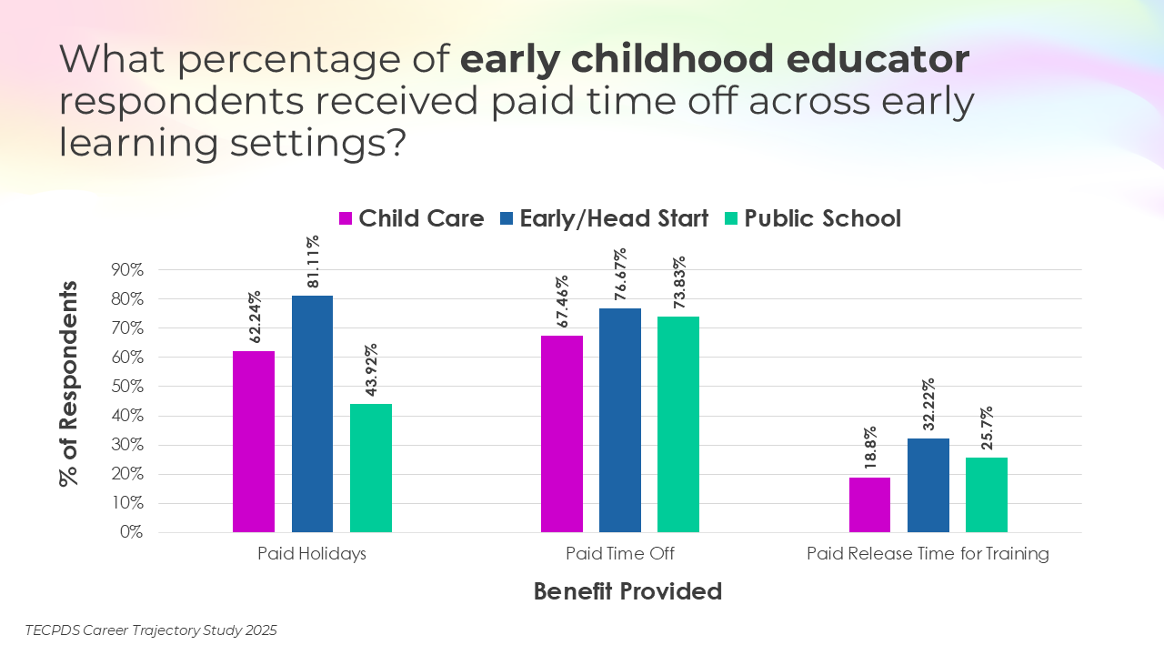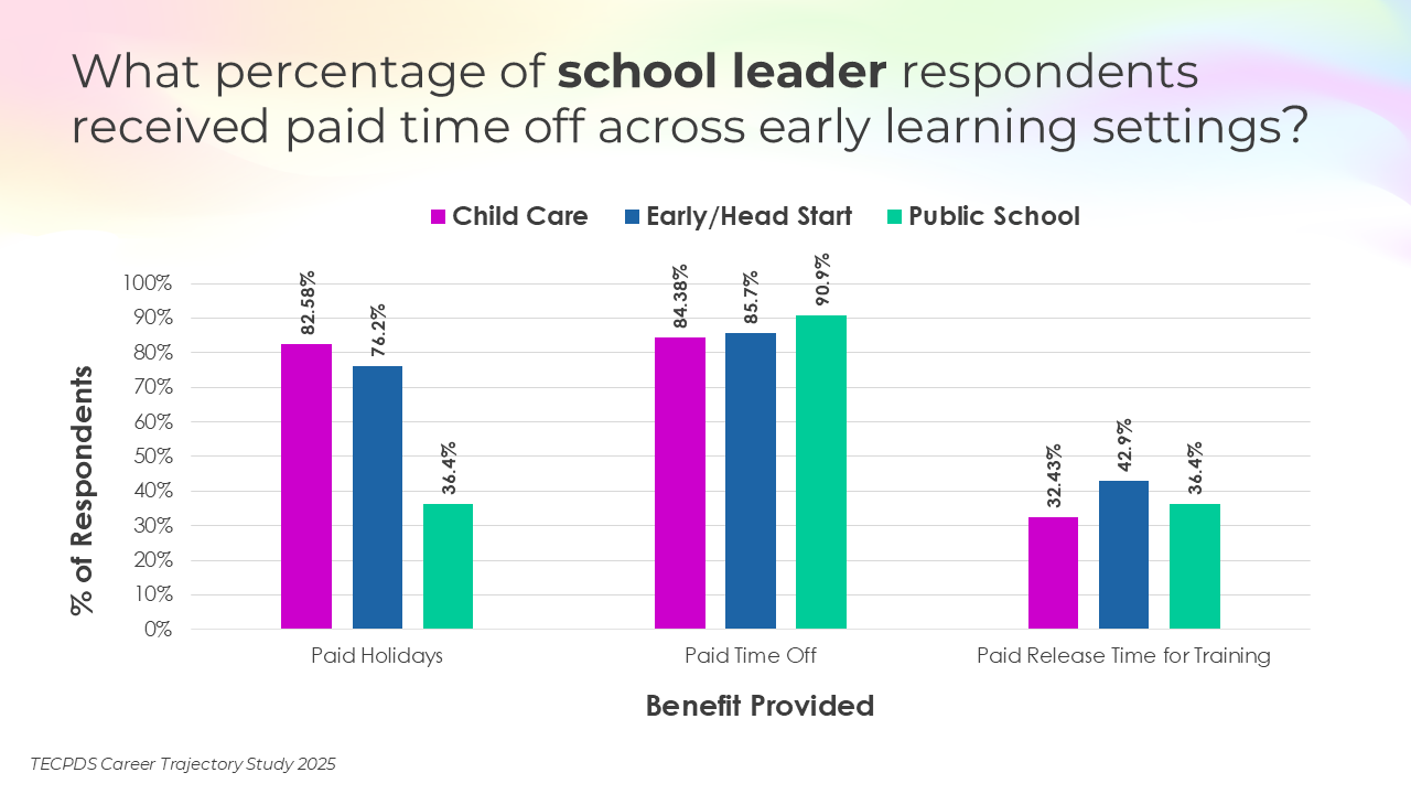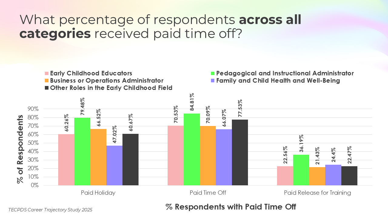 This section includes data for respondents who reported that they receive paid time off, various insurance, and other types of financial benefits. We present this data by occupational category and then broken out by early learning setting for educators and school leaders.
