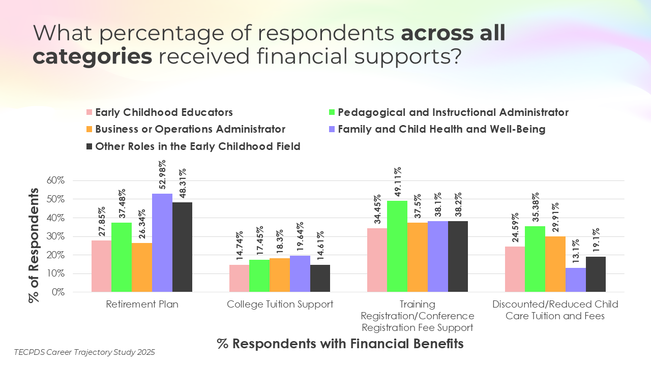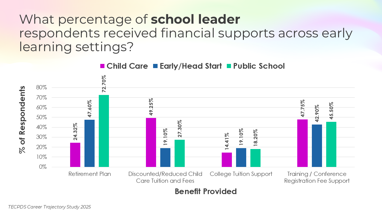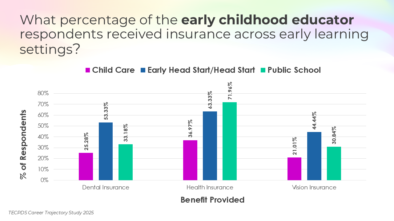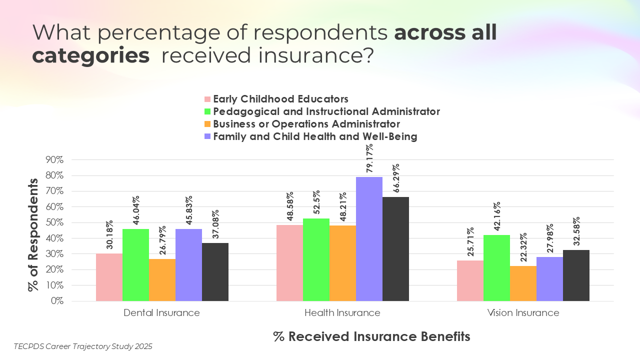 This section includes data for respondents who reported that they receive paid time off, various insurance, and other types of financial benefits. We present this data by occupational category and then broken out by early learning setting for educators and school leaders.