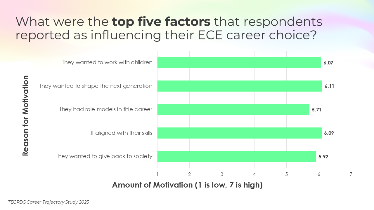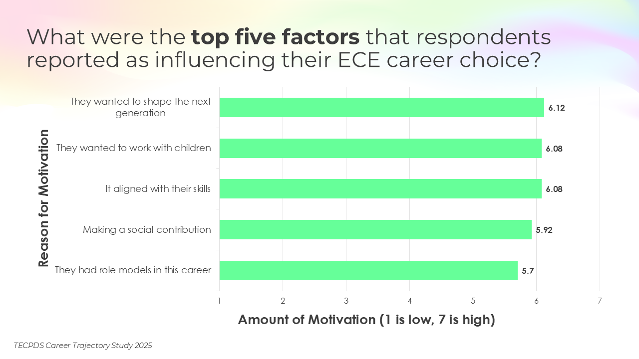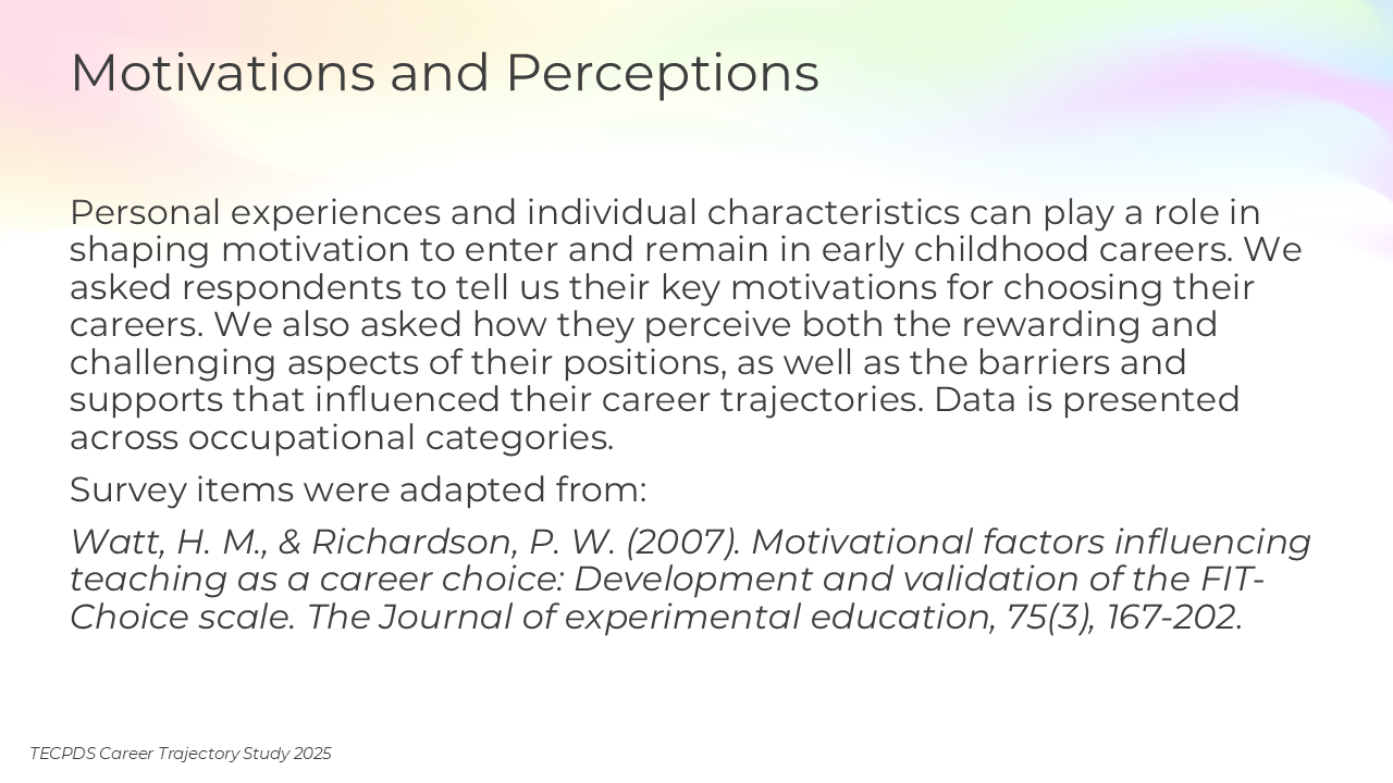 Personal experiences and individual characteristics can play a role in shaping motivation to enter and remain in early childhood careers. We asked respondents to tell us their key motivations for choosing their careers. We also asked how they perceive both the rewarding and challenging aspects of their positions, as well as the barriers and supports that influenced their career trajectories. Data is presented across occupational categories.