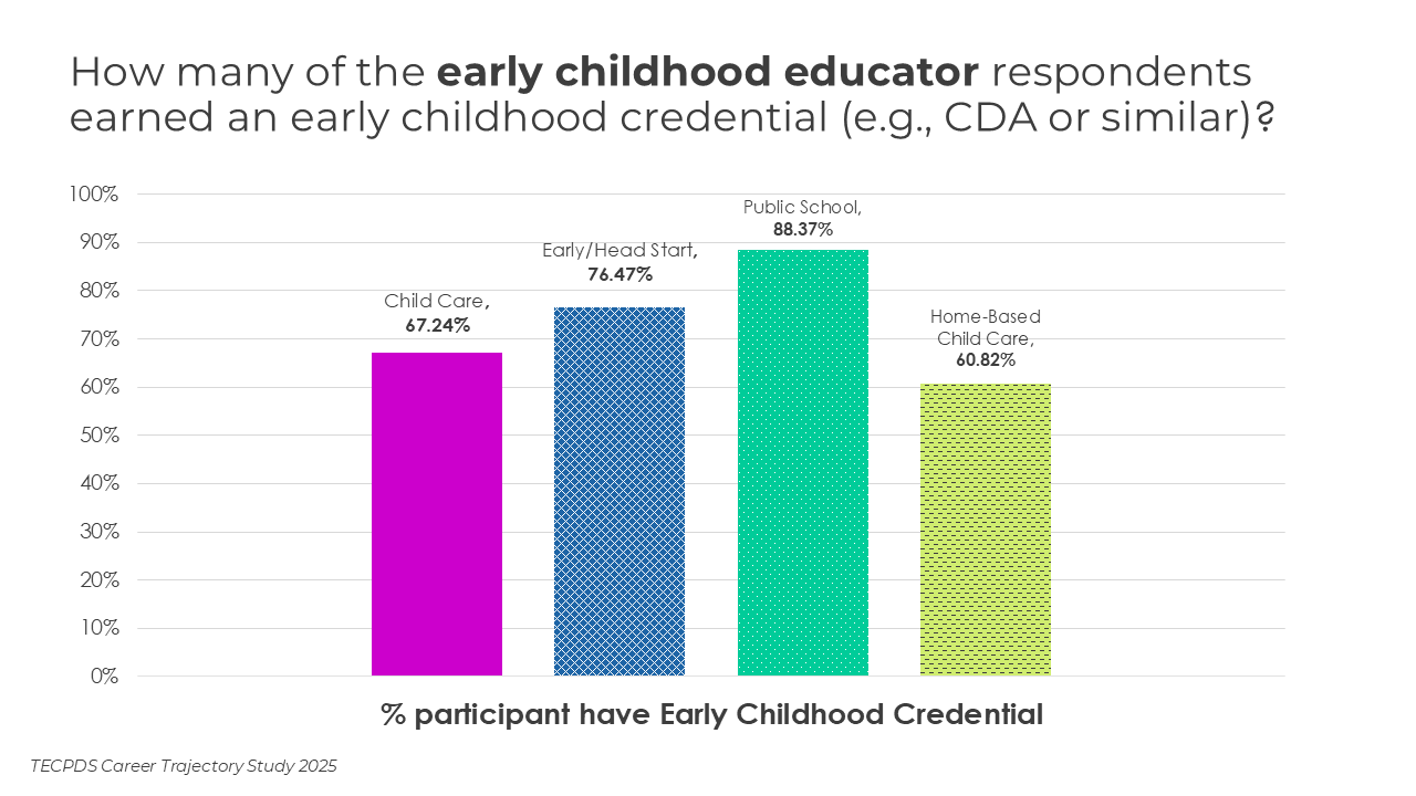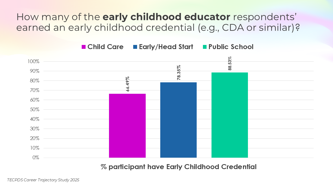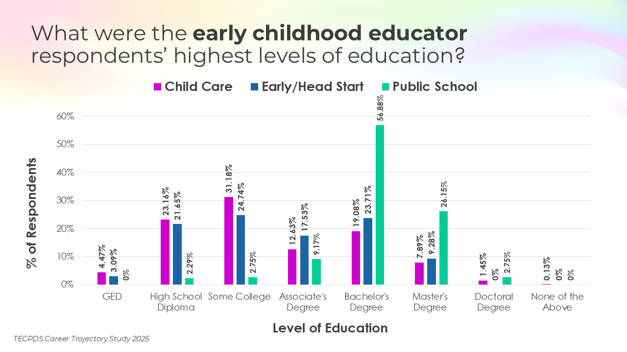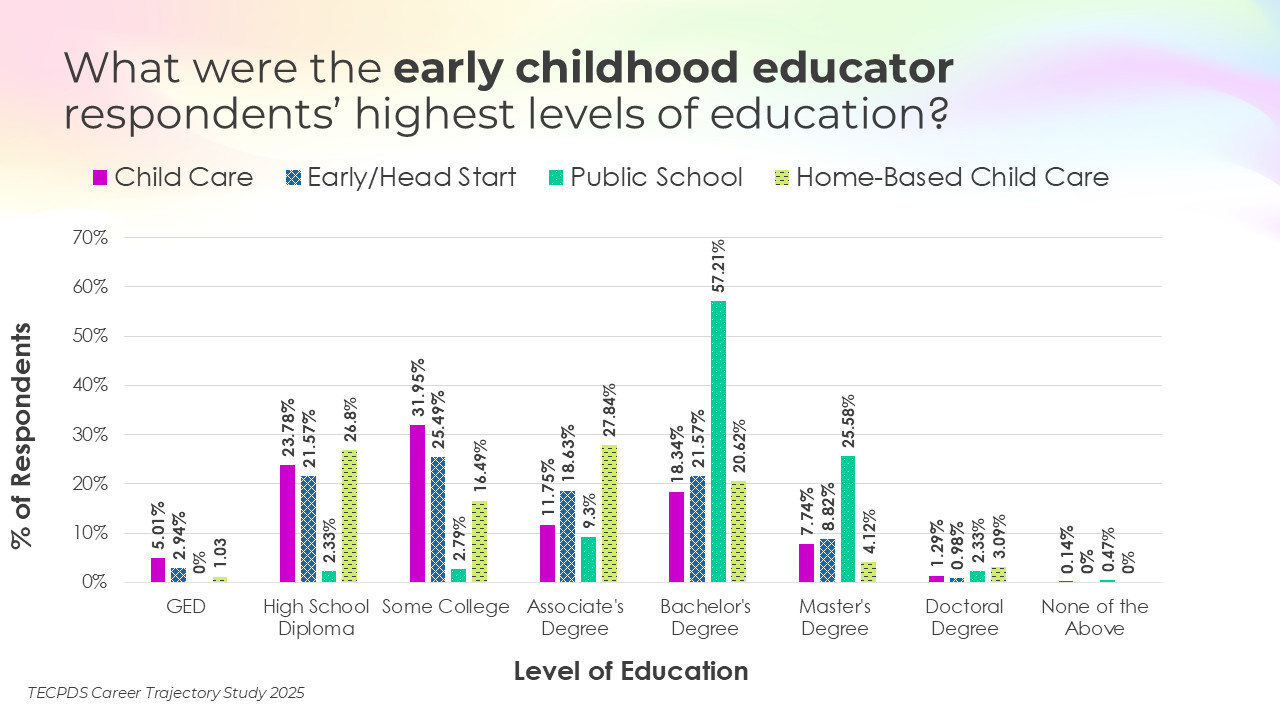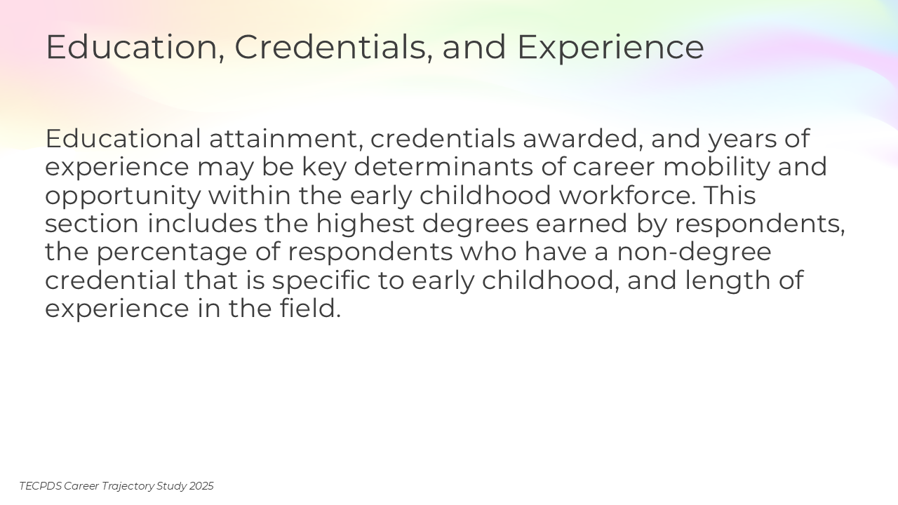 Educational attainment, credentials awarded, and years of experience may be key determinants of career mobility and opportunity within the early childhood workforce. This section includes the highest degrees earned by respondents, the percentage of respondents who have a non-degree credential that is specific to early childhood, and length of experience in the field.