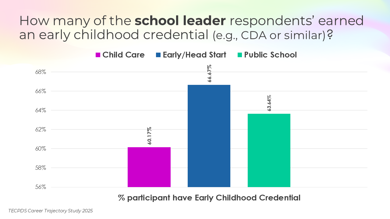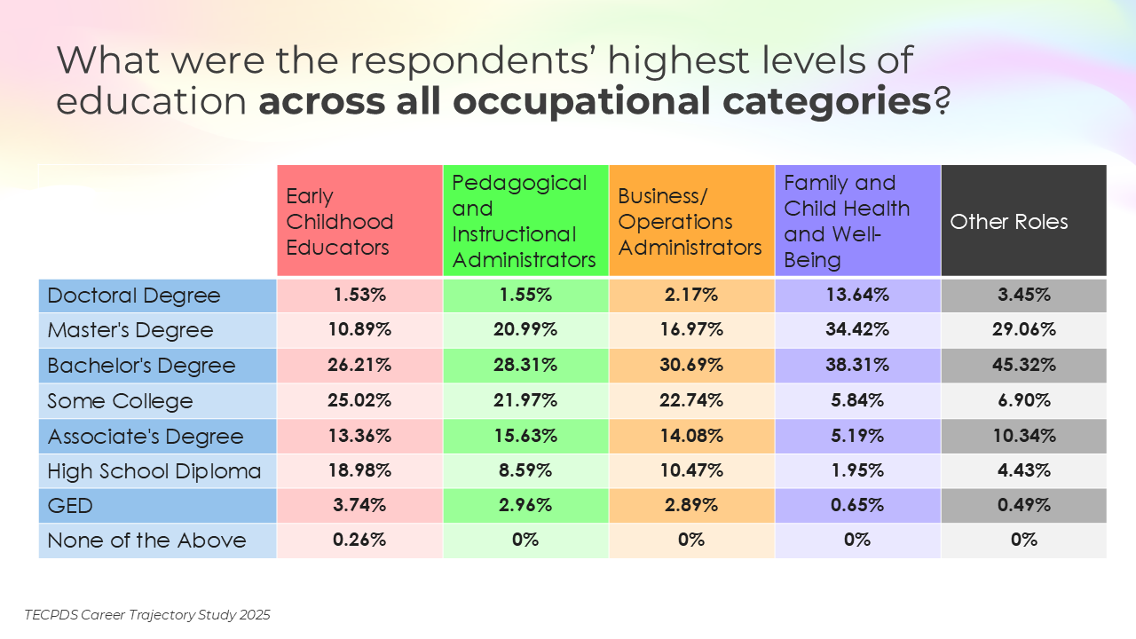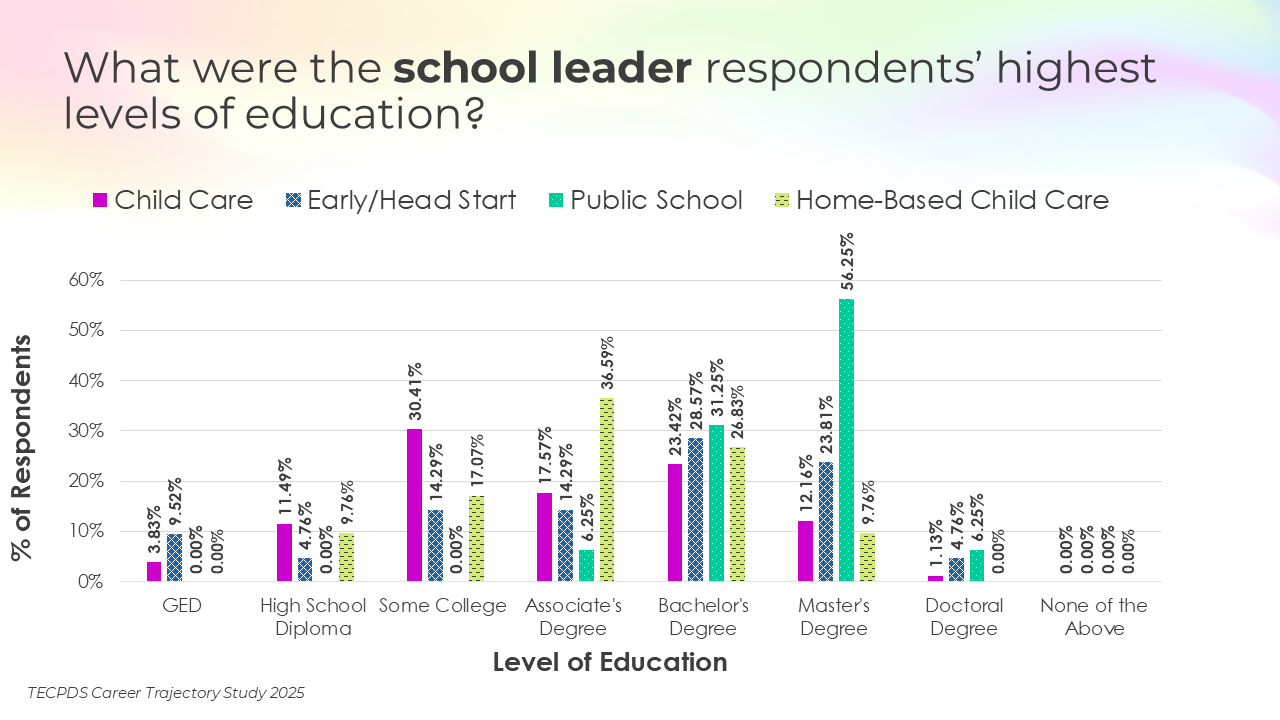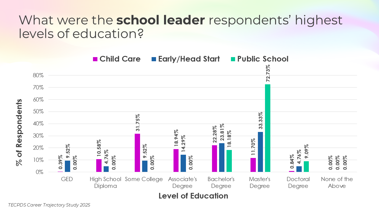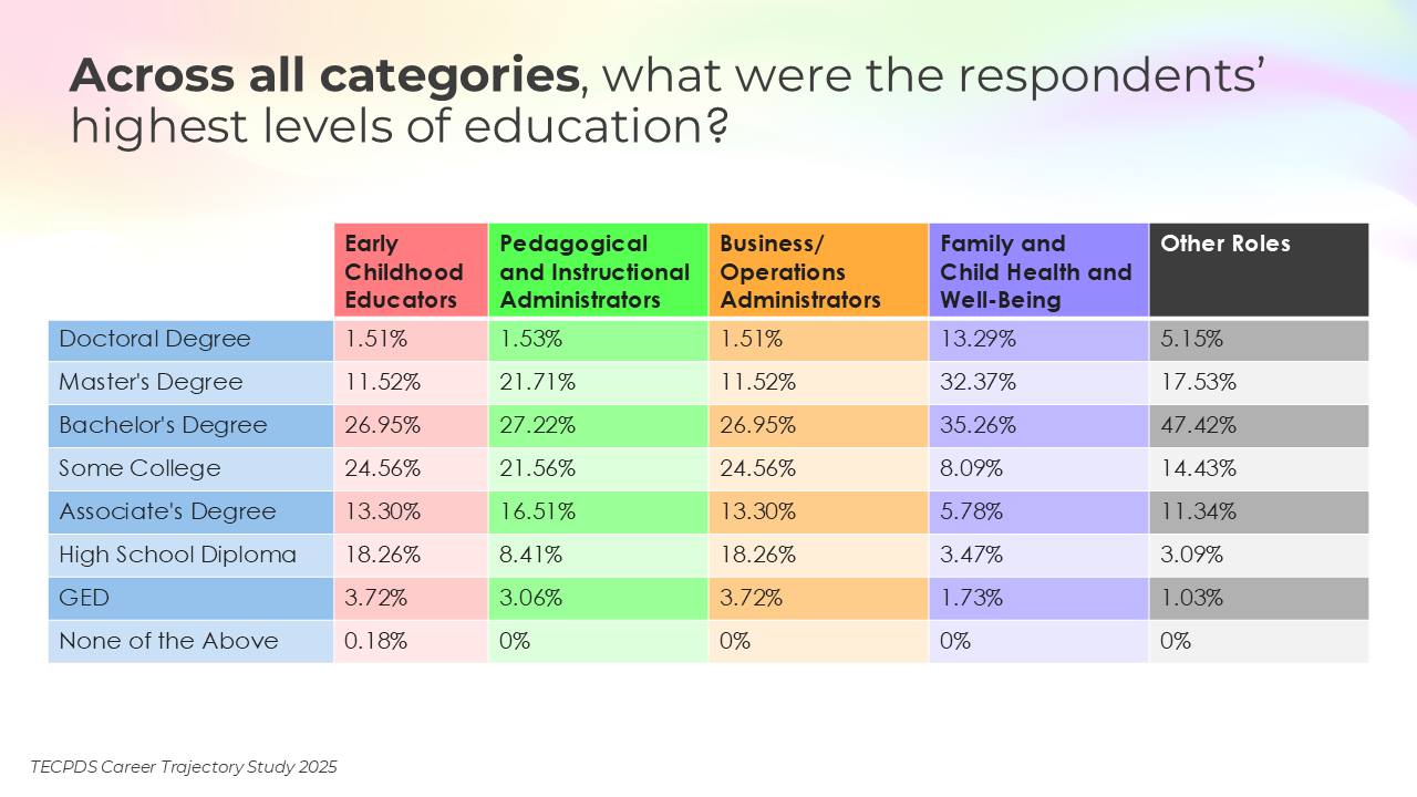 Educational attainment, credentials awarded, and years of experience may be key determinants of career mobility and opportunity within the early childhood workforce. This section includes the highest degrees earned by respondents, the percentage of respondents who have a non-degree credential that is specific to early childhood, and length of experience in the field.
