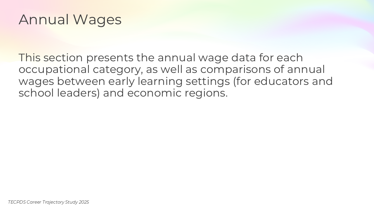 This section presents the annual wage data for each occupational category, as well as comparisons of annual wages between early learning settings (for educators and school leaders) and economic regions.