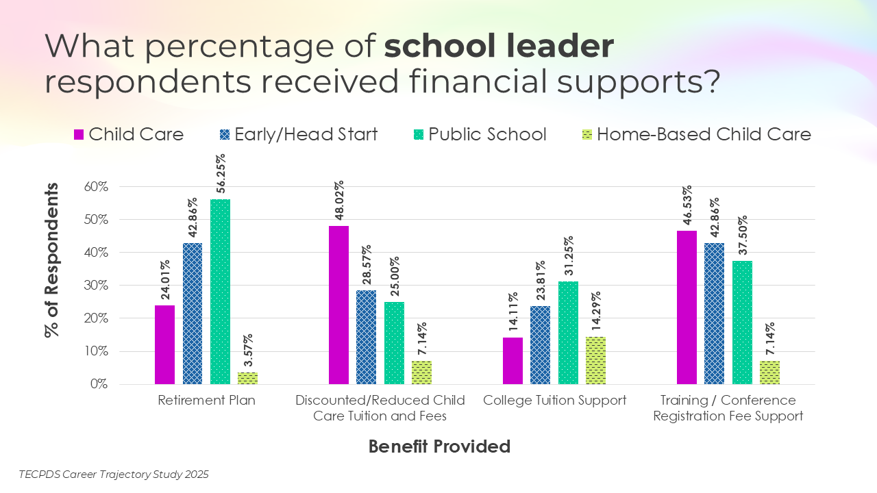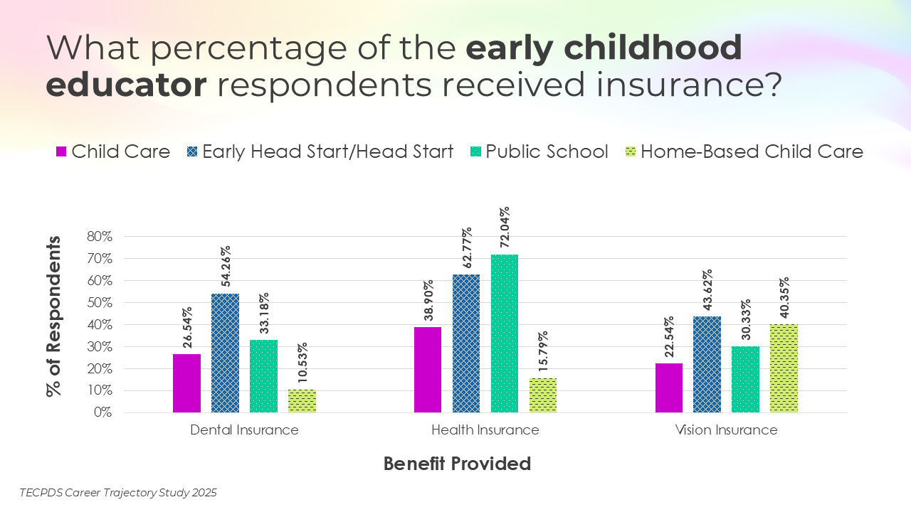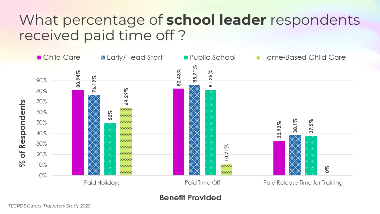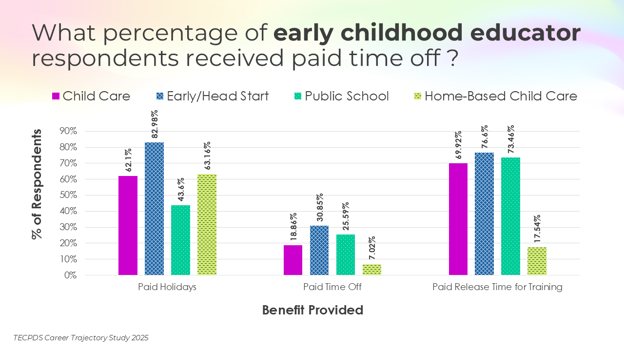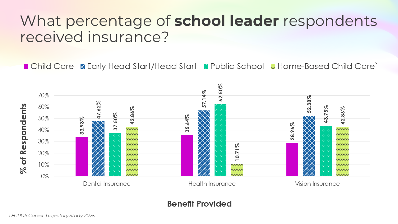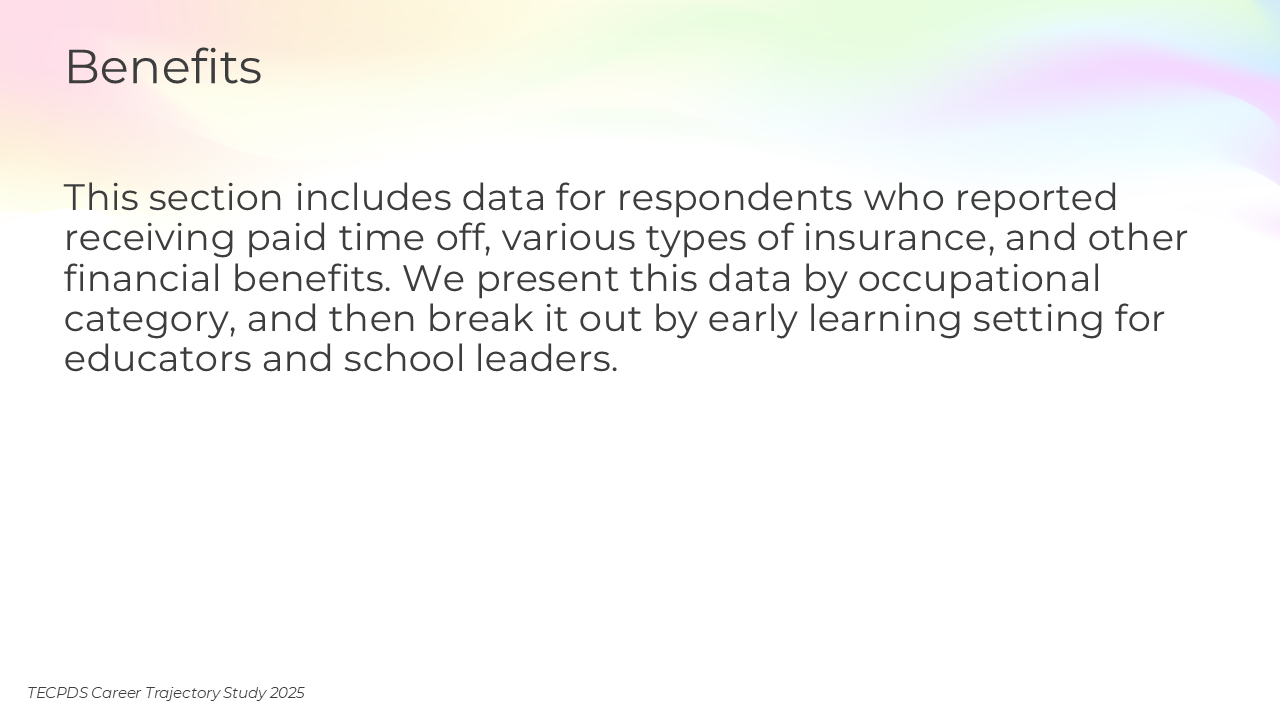This section includes data for respondents who reported receiving paid time off, various types of insurance, and other financial benefits. We present this data by occupational category, and then break it out by early learning setting for educators and school leaders.