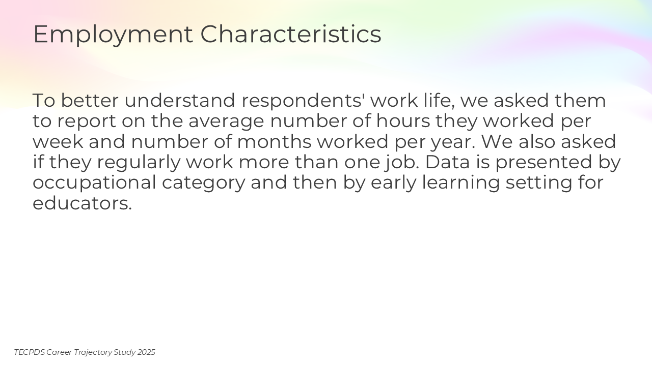 To better understand respondents’ work life, we asked them to report on the average number of hours they worked per week and number of months worked per year. We also asked if they regularly work more than one job. Data is presented by occupational category and then by early learning setting for educators.