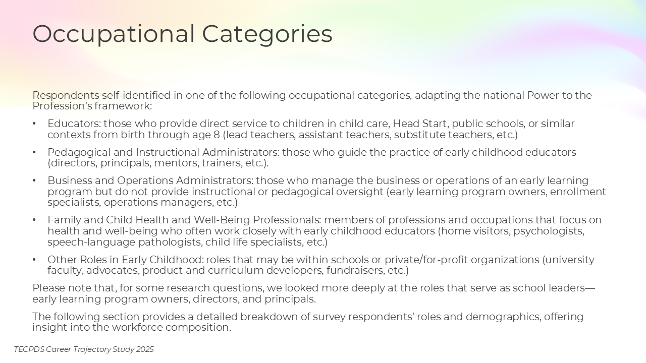 Please note that, for some research questions, we looked more deeply at the roles that serve as school leaders—early learning program owners, directors, and principals.